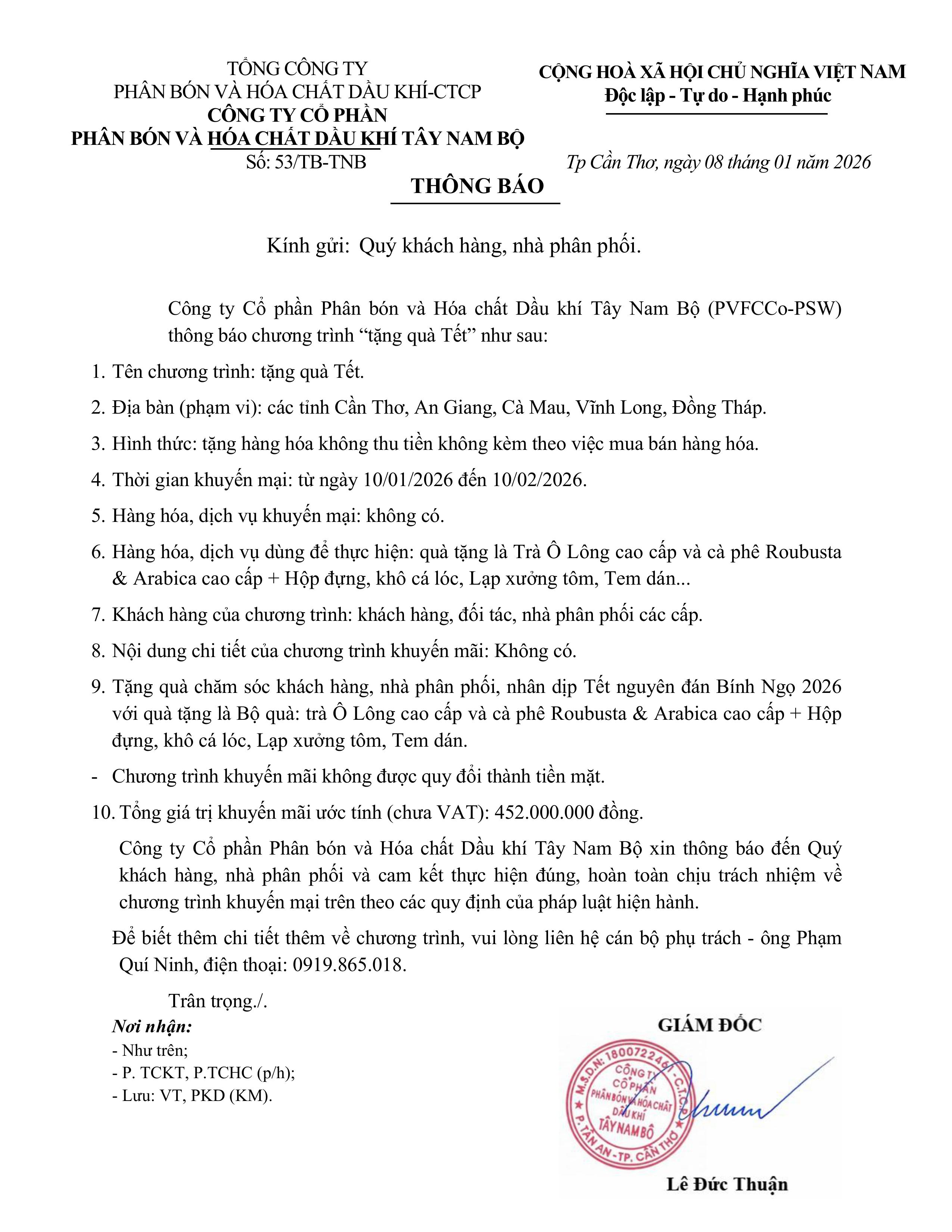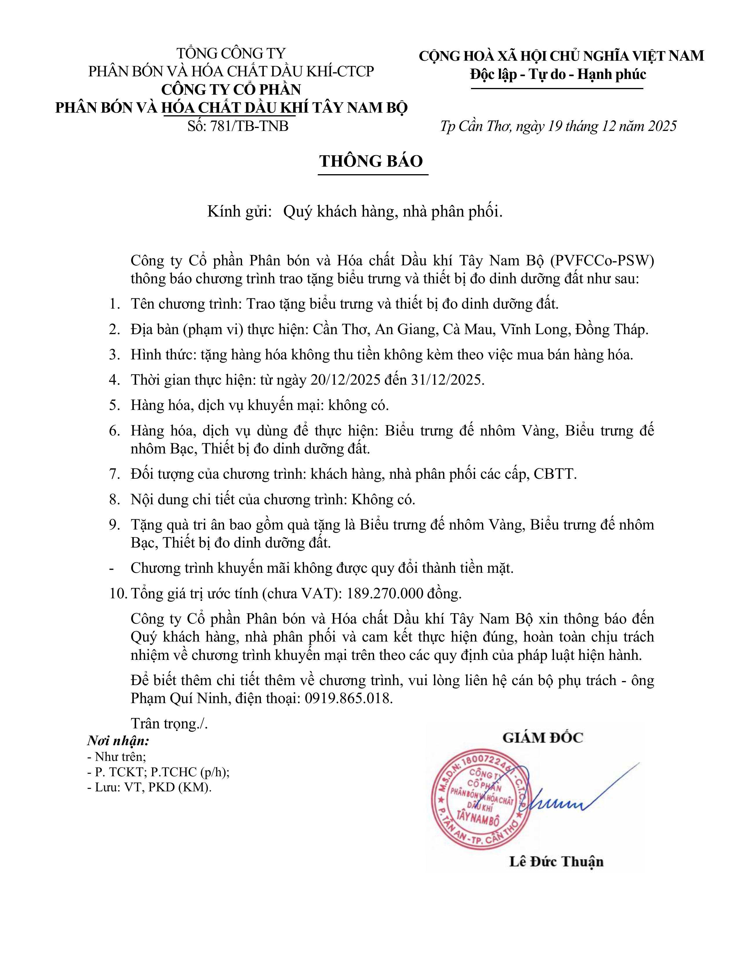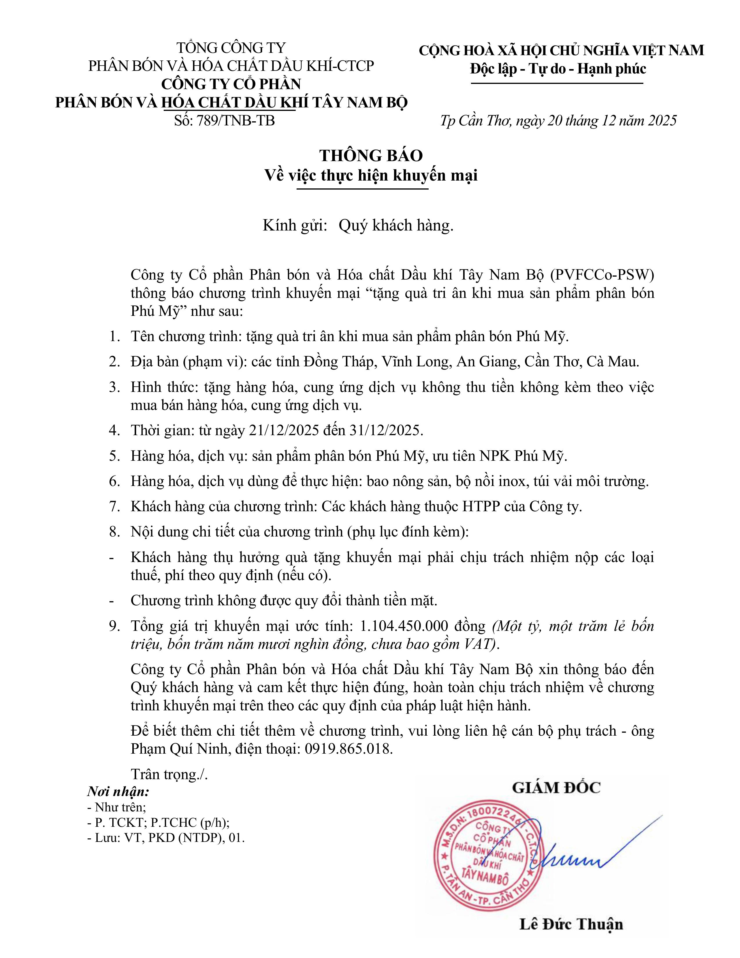- Công ty cổ phần Phân bón và Hóa chất Dầu khí Tây Nam Bộ (PVFCCo-PSW) thông báo Gia hạn thực hiện chương trình khuyến mại lần 2 (12-12-2025 17:17)