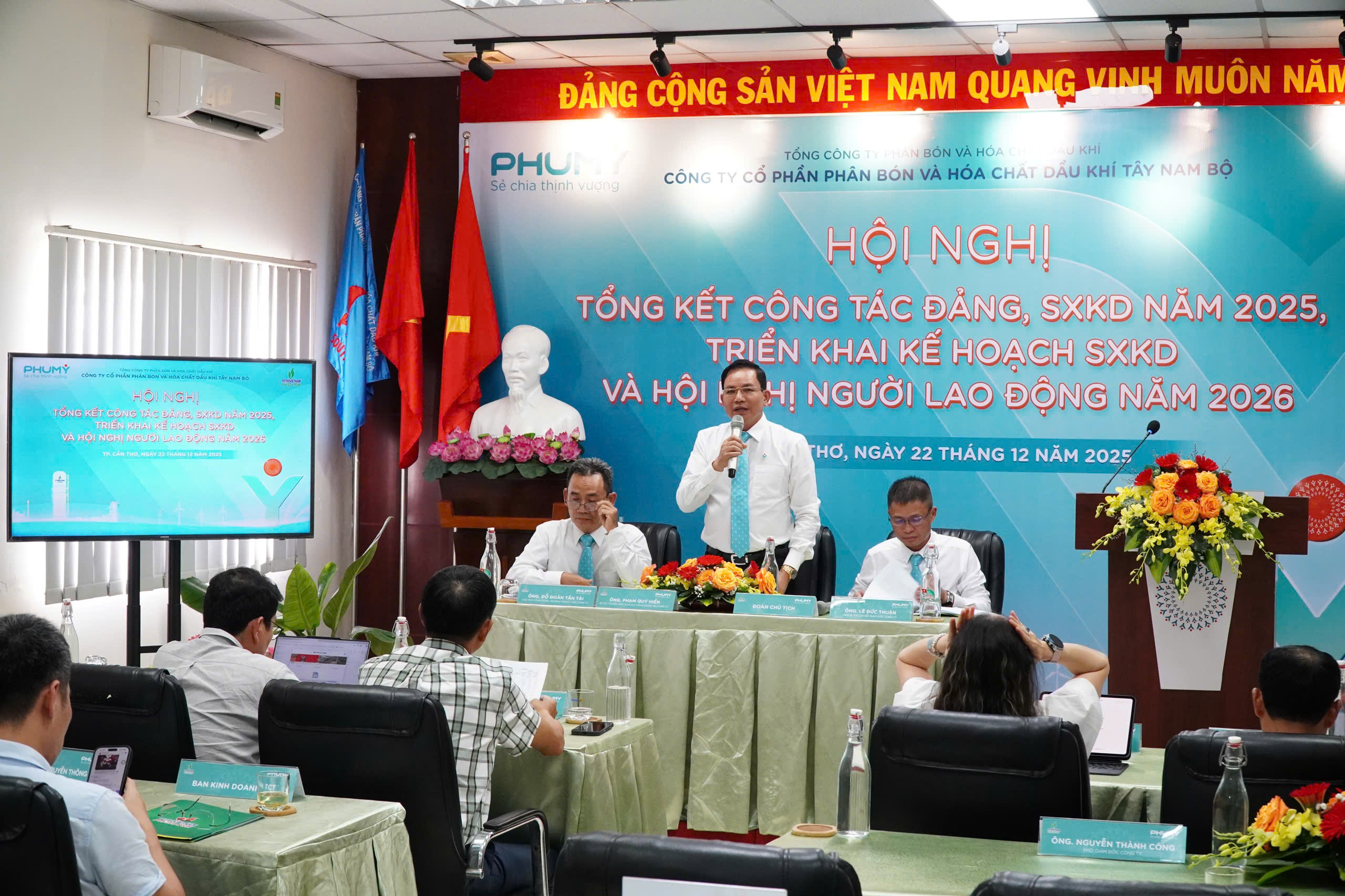 Phát biểu chỉ đạo tại Hội nghị, đồng chí Võ Ngọc Phương đã ghi nhận, tuyên dương những kết quả mà Phú Mỹ Tây Nam Bộ đã đạt được trong năm 2025. Lãnh đạo Tổng công ty mong muốn Phú Mỹ Tây Nam Bộ tiếp tục tập trung cao độ, phát huy thế mạnh của tập thể hoàn thành tốt nhiệm vụ kinh doanh năm 2026. Đồng thời tiếp tục tạo điều kiện, hỗ trợ đơn vị tổ chức hoạt động kinh doanh hiệu quả trong thời gian tới.