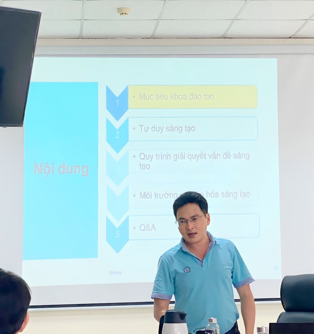 Khóa học gồm 5 nội dung: i) Mục tiêu khóa đào tạo; ii) Tư duy sáng tạo; iii) Quy trình giải quyết vấn đề sáng tạo; iv) Môi trường và Văn hóa sáng tạo; v) Q&A.